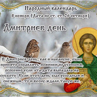 СЕГОДНЯ 8 НОЯБРЯ ДМИТРИЕВ ДЕНЬ БОЛЬШИЕ ОСЕНИНЫ Этот день в 2021 году -https://www.asienda.ru/post/59152/ В 2022 году -https://www.asienda.ru/post/60499/ В 2023 году - https://www.asienda.ru/post/61866/ В 2024 году - https://www.asienda.ru/post/62723/ Больше информации об этом днев разделе "Праздник каждый день" 2017 - https://www.asienda.ru/post/47196/ ПРИМЕТЫ НА 8 НОЯБРЯ: - По данному дню судили о Пасхе и весне в целом... Читать далее»