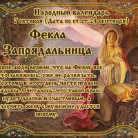 СЕГОДНЯ 7 ОКТЯБРЯ ФЁКЛА ЗАРЕВНИЦА ФЁКЛА ЗАПРЯДАЛЬНИЦА Этот день в 2021 году - https://www.asienda.ru/post/59073/ В 2022 году - https://www.asienda.ru/post/60396/ В 2023 году - https://www.asienda.ru/post/61770/ В 2024 году - https://www.asienda.ru/post/62646/ Больше информации об этом днев разделе "Праздник каждый день" 2017 - https://www.asienda.ru/post/46827/ ПРИМЕТЫ НА 7 ОКТЯБРЯ: - Птицы низко к земле летят – зима будет ранняя и холодная... Читать далее»