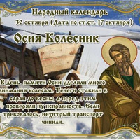 СЕГОДНЯ 30 ОКТЯБРЯ ОСИЯ КОЛЕСНИК Этот день в 2021 году - https://www.asienda.ru/post/59130/ В 2022 году - https://www.asienda.ru/post/60470/ В 2023 году - https://www.asienda.ru/post/61834/ В 2024 году - https://www.asienda.ru/post/62704/ Больше информации об этом днев разделе "Праздник каждый день" 2017 - https://www.asienda.ru/post/47102/ ПРИМЕТЫ НА 30 ОКТЯБРЯ: - Кошка спит крепко – к теплу - Домашний гусь крыльями машет – к дождю... Читать далее»