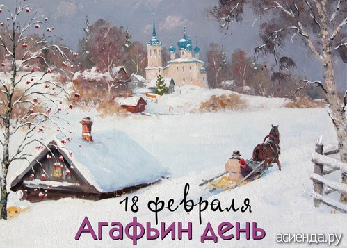 Народный календарь 18 февраля — Агафья Коровница. Считали Агафью покровительницей скота, и защитницей от огня. В этот день существовала традиция освящать хлеб, соль и воду, которые по поверью, охраняют от молний и пожаров то место, где находятся. «Хлеб святой Агафьи» даже принято было брать в дорогу, отправляясь в дальнее странствование. В Агафьин день наблюдали за погодой: если было тепло, то и в ближайшем будущем холодов не предвиделось. В то же время мороз предвещал дружную весну, сухое и жаркое лето. |