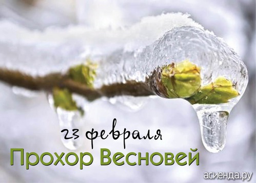 Народный календарь 23 февраля — Прохор Весновей. Весновеем Прохора прозвали за то, что в этот день начинался поворот на весну. Говорили так: «До Прохора старуха охала: „Ох, студно“, — пришел Прохор да Влас: „Никак, скоро весна у нас“. В то же время зимы еще остерегались и просили: «Лютуй, февраль, не лютуй, а на весну брови не хмурь». Впрочем, мороз, по мнению людей, и сам понимал, что властвовать ему оставалось недолго: «На Прохора и зима заохает, а февраль бушует, но весну чует». |
