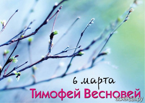 6 марта — Тимофей Весновей. У берез и кленов начинается сокодвижение. В этот день начинали дуть теплые ветры. Встарь говорили: «Дожить до Тимофея — а там и зима не страшна». Старики, зимовавшие в избе на печи, в этот день выбирались на завалинку — погреться на солнышке да поговорить: «Тимофей тепло веет, стариков греет». Если день выдавался погожим — такой же должна была быть и вся весна. Слушали также гром. Если первые раскаты послышатся при северном ветре — к холодной весне, при восточном — к теплой и сухой, при южном — просто к теплой. |