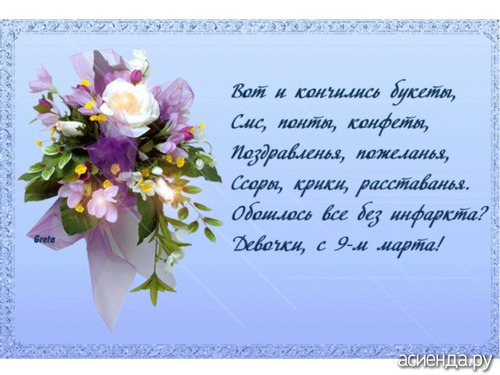 С новой весной вас, с каплями первыми! Мирного неба вам, солнца лучистого, Счастья заветного, самого чистого! Много в вас ласки, тепла, доброты, - Пусть исполняются ваши мечты! |