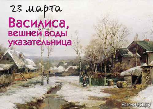 23 марта — Василиса — вешней воды указательница. В этот день хозяева занимались весенними заботами: нужно было отвести воду от дома, чтобы не ушла в подпол. Для этого выходили во двор и рыли каналы. На Василису нередко выходили на промысел: считалось, что если на реке в лунку бегут весенние ручьи, то хорошо ловится плотва. Начало паводков; весенние ручьи уже вовсю торят себе дорогу. Порой в этот день приходят первые грозы. Если погода пасмурная, летом жди хорошего урожая льна. Как бы то ни было, весна уже наступала неизбежно, и в народе говорили: «Василисин туман съедает снег». |