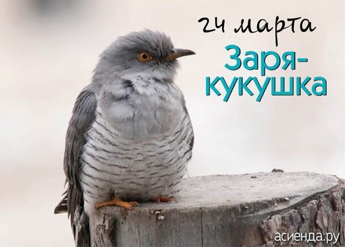Народный календарь 24 марта — Заря-кукушка. Подмечено, что иногда в эту пору можно услышать первую кукушку. С кукушкой было связано несколько примет. При первых звуках голоса этой птицы нужно было брякнуть деньгами — «чтобы водились». С этого дня начинались активные работы в саду. На Руси считалось, что именно в этот день начинается движение сока в березах. Также подмечали приметы на погоду. Если ночью бывал иней — это означало, что днем снегопада не будет. Впрочем, пушистый иней обещал и хорошую погоду. Если к концу марта заканчивались холода — можно было ждать теплого лета. |