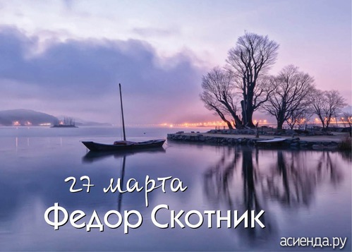 27 марта — Федор Скотник. Следовало уделить внимание домашней скотине: животных чистили, обихаживали, заговаривали от сглаза. «На Федора Скотника не ленись — скотинке поклонись», — говорили крестьяне. Когда начиналось активное таяние снегов, примечали, как меняется уровень воды в реках: если не прибывает вода, лето придет сухое и жаркое. Бытовала и такая примета: коли весенняя вода медленно течет — год тяжелый обещает. |