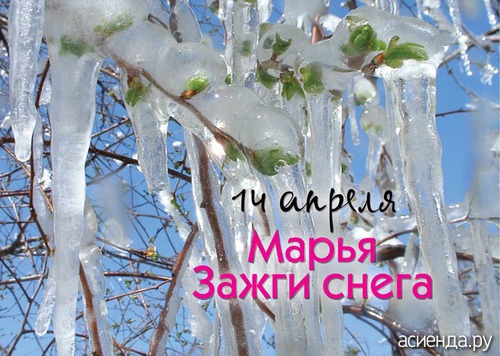 14 апреля — Марья Зажги снега. Примечали, как снег тает, как лед уходит: если быстро — год ожидается хороший, легкий; если по берегам лед остался — впереди тяжелый год. Если на Марию вскрылись и разлились реки, покосы будут богатые, травы много. Ясная ночь обещает сухое теплое лето. К середине апреля обычно иссякали запасы квашеной капусты, а потому было у этого дня и другое название: Марья — пустые щи. А про того, кто желал чего-то несбыточного, говорили: «Захотел в апреле кислых щей». |