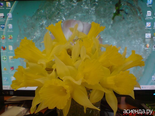 Это вам мои нарциссы:Красивый букетик, а у меня в этот год не очень густо цветут. А у нас сегодня пасмурно и дождик я посеяла свёклу морковку и лук посадила. эксперимент