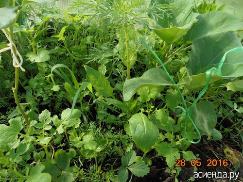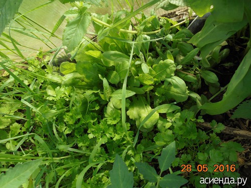 У меня там и салаты, и рассада ещё сидит, и постоянные жители уже высажены! Моя мама нарвала вместе с салатами и укропами листья баклажана. Ну не разобралась немножко...