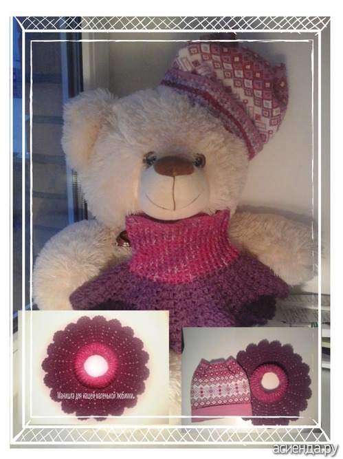 А это манишка, шапку чуть раньше сшила, ее уже носитСвет классный комплектик получился,а шапку шила из чего?Я подумала,что вязаная. |