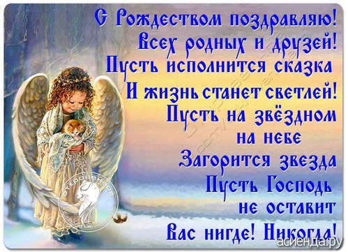 Рождественский Сочельник — для чудес! И сбудутся пусть наши пожеланья: Отступит перед Ангелами бес! Пусть чистота души откроет двери в счастье, Звезда взойдет и станет мир светлей, И хоть бы справедливей в одночасье! От нас зависит — будем же добрей. Желаю процветанья и успеха В Сочельник пред Христовым Рождеством, Сияют пусть глаза от радости и смеха, Пусть счастьем будет полон каждый дом! |