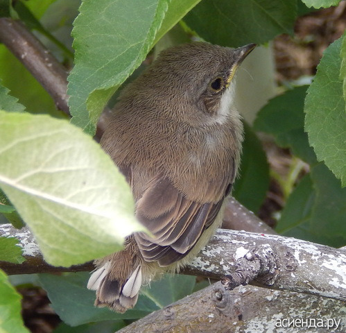 Птенец совсем малюсенький, не двигается. Его и не видно в яблоне. Мама ему носит корм.
