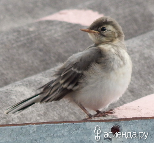 Слеток трясогузки, совсем маленький, но хвостиком уже качает. Мама всегда рядом