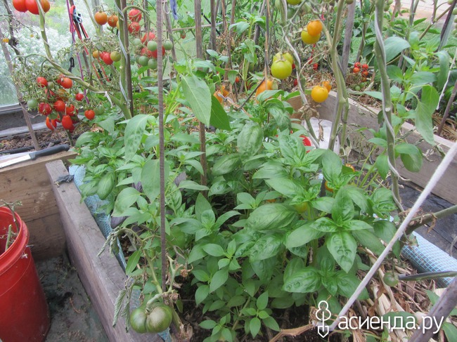 Еще в парнике растет базилик. Отлично пошел в рост между помидорами! Еще я его посадила к фасоли, там он не так хорошо растет. Очень рекомендую сажать помидоры и базилик вместе: