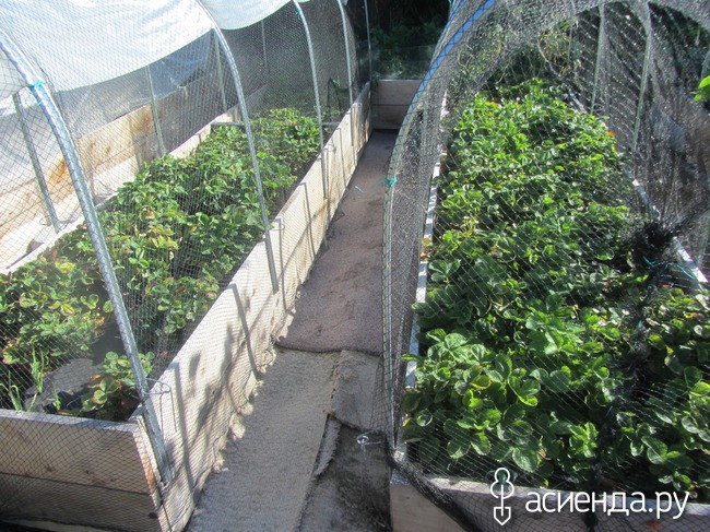 Вот грядочки с клубникой. Не удивляйтесь, что они затянуты сеткой - у нас очень агрессивные черные дрозды и они просто все слопают на раз-два