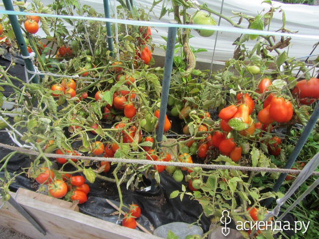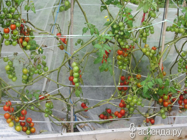 Помидоры растут еще на одной грядке – я их туда посадила случайно. Там росла альпийская земляника, у которой начали сохнуть листья, и я решила, что от солнца. Ну и загородила ее белым лутрасилом, а по краешку посадила сорт Томаччио – это очень сладкие черри. Кстати, они такие сладкие, что у меня возникает чувство вины, когда я их ем. Я все же на диете и конфеты – это ноу-ноу. У них интересно с листьями. Видите, их почти нет? Они сохнут, как только начинают краснеть плоды снизу. Ну я их и обрываю. Еще два интересных момента. Первый – этот сорт может высохнуть прямо на ветке и превратиться в помидорный изюм. Это ООООООООООЧЕНЬ вкусно! Второе - Томаччио растет вверх настолько, насколько вы ему позволите. Сейчас в нем полтора метра, причем я его формирую наклонно, и он явно не собирается останавливаться на достигнутом…. Так что я вижу в этом сорте реальную конкуренцию Помидорному дереву. Мой помидорный лес на вкус – намного лучше.