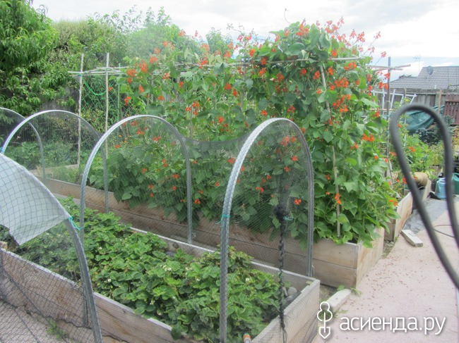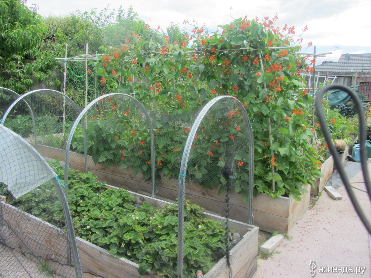 Рядом с клубничной грядкой – фасоль. Я – вегетарианка и очень много ем фасоли. Пока молодая – стручковую, а потом жду, пока созреет, и использую уже как обычную фасоль.