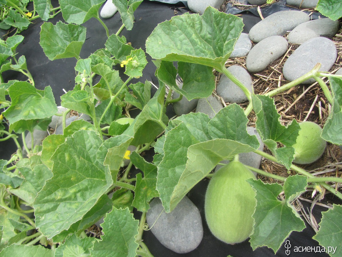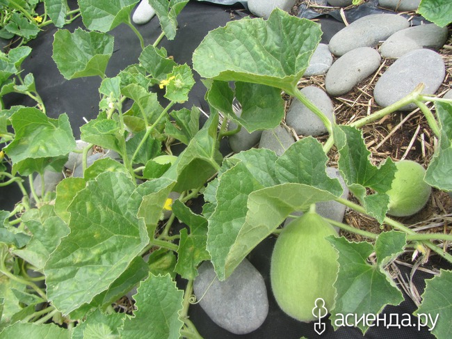 За фасолью – грядка с дыньками. Сорт называется Гайла. Это зеленая дыня, очень сладкая. В России я таких не видела. Но вызреет или нет – не знаю.
