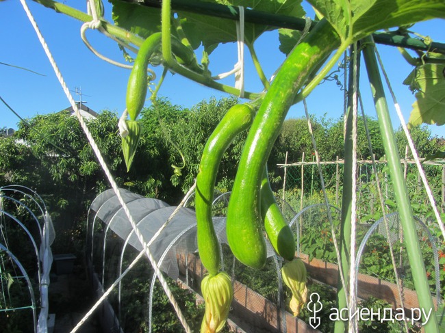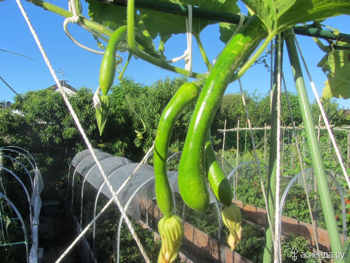А перед высокими грядками – грядки пониже, на одной из них растут кабачки по имени Рампиканте – итальянский сорт длиннющих кабачков. Мой чемпион был длиной ровно в метр. Я его срезала, потому что опасалась за здоровье шпалеры. И их МНООООООГО! Они удобны не только тем, что растут как лианы, но и тем, что семена в них все находятся в утолщении на конце, и тем, что у них довольно плотная вкусная мякоть. Запечь кружочками в аэрогриле, намазать сверху песто – это что-то невероятно вкусное!
