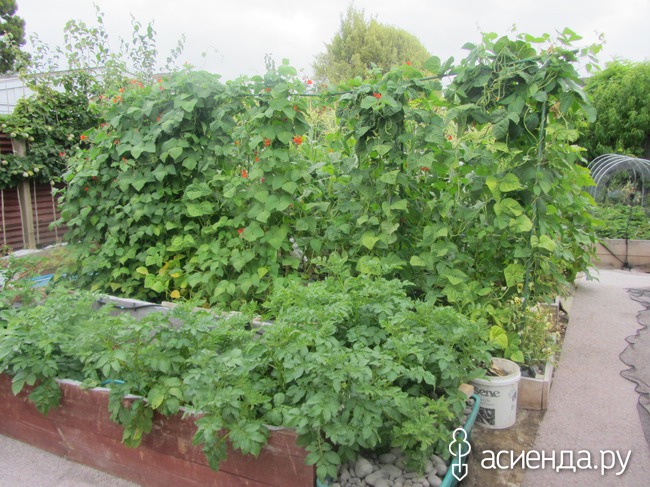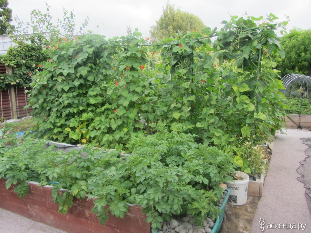 А это – вид в начале огорода. Спереди стоит короб, который мы перевезли с прежнего участка, и он стоял пустой. Я положила туда картошку, засыпала соломой, и теперь когда нужна картошка, запускаю руку пониже, нащупываю покрупнее, и забираю. Она чистенькая, приятная. Остальные картошечки растут себе дальше. Подтверждаю - картошка там не хранится, а РАСТЕТ! Причем, хорошо растет, и практически без полива. За коробом – три невысокие грядки. На первой растет фасоль нескольких сортов, на второй – кукуруза (уже собрали 4 штучки), на третьей – кабачки Рампиканте.