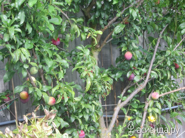 Теперь о деревьях. На участке их больше 20, я со счету давно сбилась. В основном все на шпалере вдоль забора. Есть даже распятый грецкий орех, на котором в этом году появились два первых орешка