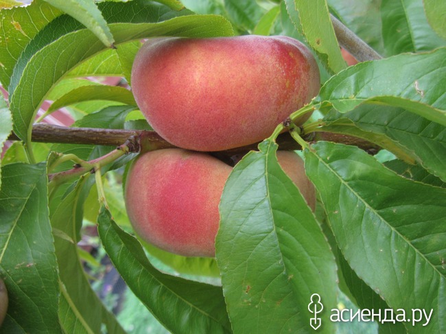 Есть еще - тоже распятые - нектарин, 2 черный персика, чернослив, 5 фейхоа, 6 яблонь. Еще есть одна карликовая яблоня, апельсин, грейпфрут, лимон, 2 лимонада, 2 мандарина, и 3 полноразмерных, но пока еще маленьких, дерева - яблоня с тремя сортами, черешня и плоский персик. Вот плоский персик: