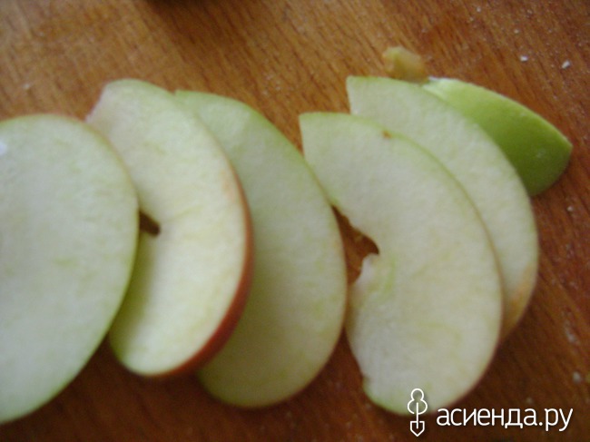 Разрежьте яблоко на 4 части, срежьте сердцевину, а затем нарежьте тонкими ровными ломтиками. Удобнее всего это сделать овощерезкой. Но я порезала ножом