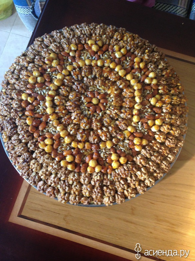 А то что сверху разукрасила, так это заранее выбрала цельные орехи, мокала в мед и клеила рядами, ну и рисунок из миндаля с фундуком и семечками по ходу придумала.