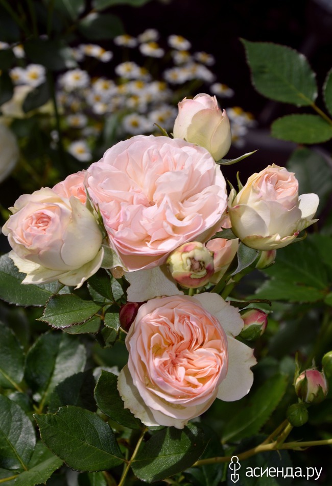 затем - белым, в дождливую погоду может появляться розовая кайма, розетковидный, густомахровый, 70 - 90 цветков в одном цветке, диаметр цветка 6 - 8 см, обладает пряным ароматом, очень долго сохраняет форму. Цветение:повторное, продолжительное, цветки собраны в соцветия, на одном цветоносе в период массового цветения насчитывается 3 - 8 цветков одновременно. Мировые награды:звание «Золотая Роза» конкурса роз Баден-Баден (Германия), 2003, почетная грамота конкурса роз Лион (Франция), 2006, ADR (Германия), 2007, золотая медаль конкурса роз Саверн (Франция), 2010.