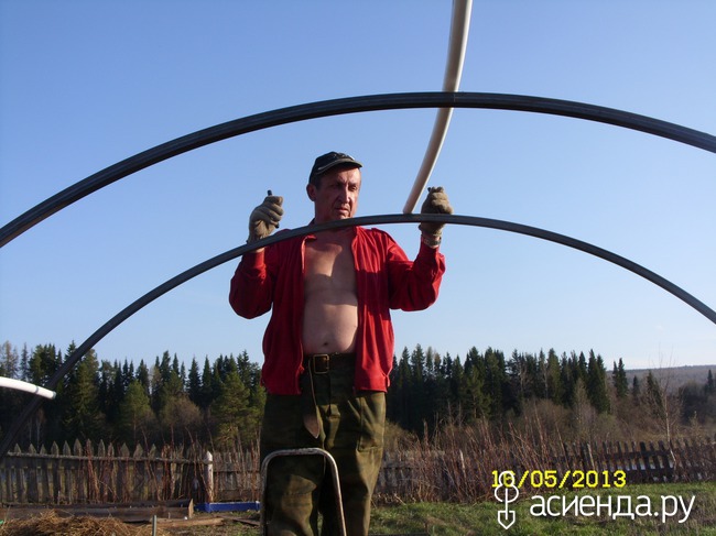 В которой надо было ходить полусогнувшись, Посередине стояли два столба для поддержки крыши. И в ней выращивалось все. И томаты, и огурцы, и перец. Я возмутилась и мужу сказала, что ничего в ней сажать не буду, т. к. в таком положении работать не смогу Весной 2013 года он начал с постройки теплицы. Делал из того, что было под рукой - из пластиковых труб. Только дуги купили в магазине Мы как могли помогали... Моменты строительства я запечатлела... Прошу не судить строго...