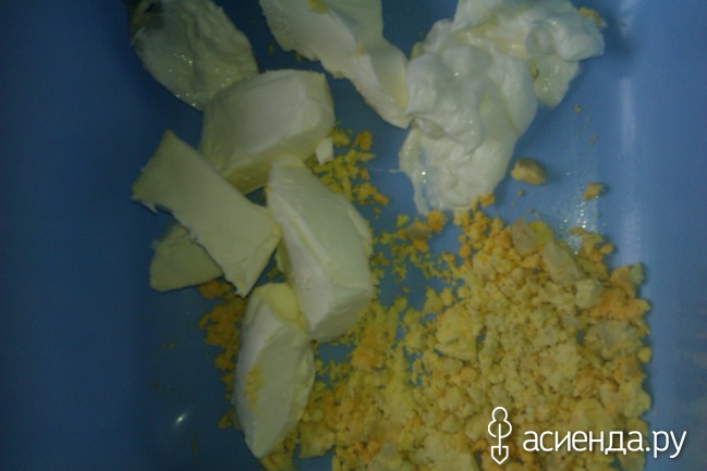 Размягченное сливочное масло растираем с вареными желтками и 2-мя ложками сметаны.