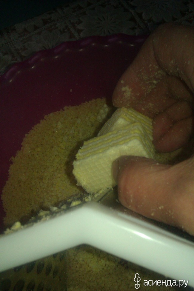 Затем каждую печенюшку-шарик обмакиваем в глазурь, хорошенько обваливаем в вафельках и складываем на большую плоскую тарелку. можно я не буду показывать этот "грязный процесс"? ведь и так все понятно...
