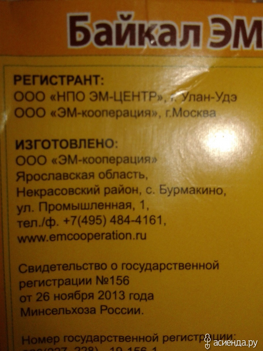 Здравствуйте! Я купил концентрат Байкал ЭМ1 ООО "ЭМ-Кооперация", Россия, Ярославская обл., Некрасовский р-н, с. Бурмакино, ул. Промышленная, д.1, тел. +7 (495)484-4161, 484-3977, 484-3674