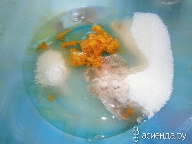 Белок, сахар, цедра апельсина, и сода гашеная (разрыхлителя не было)- все смешать.