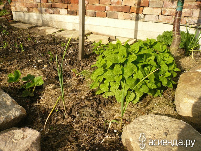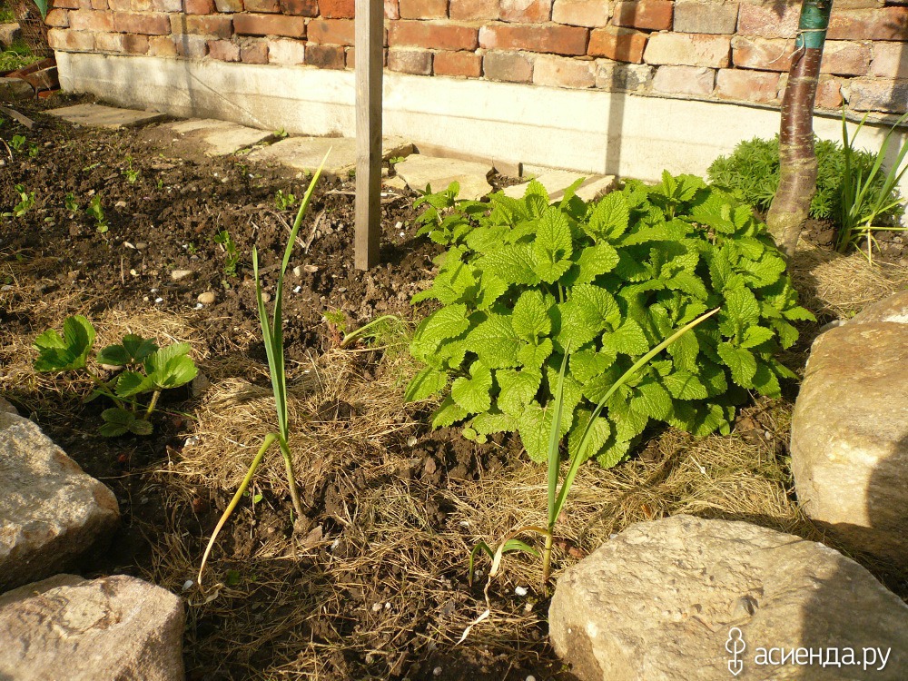 Грядочка эта рядом с высокой, по краю земляника. Парочка головок чеснока. Кустик мелиссы я посадила сюда специально. Зять где-то прочитал, что запах мелиссы каким-то образом защищает землянику от болезней. Пусть растет) за мелиссой кустик герани уличной. Ну это для красоты)))