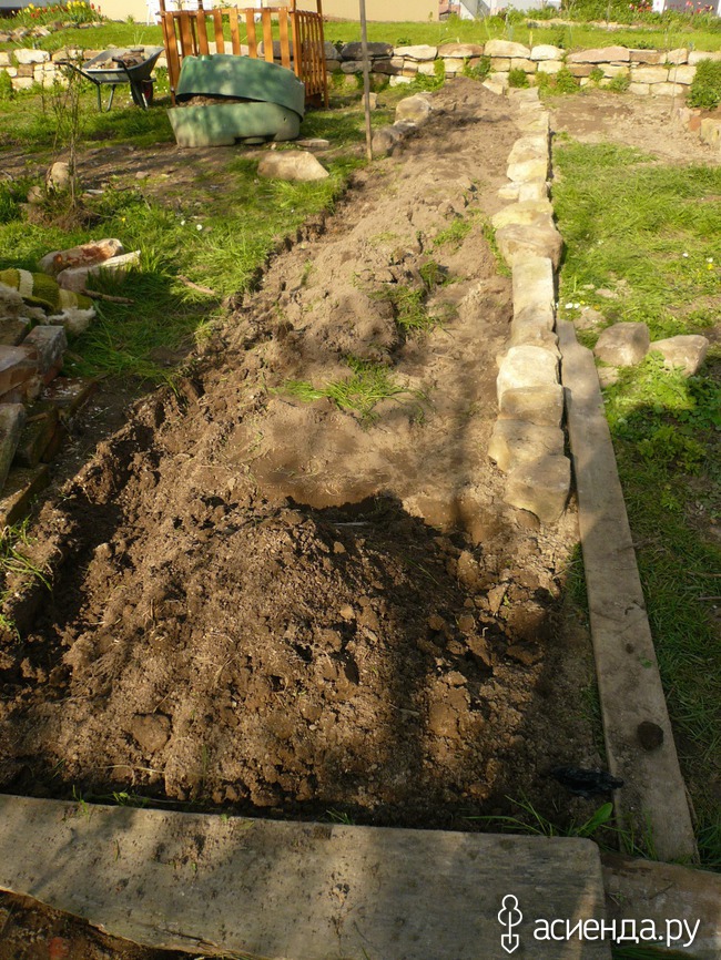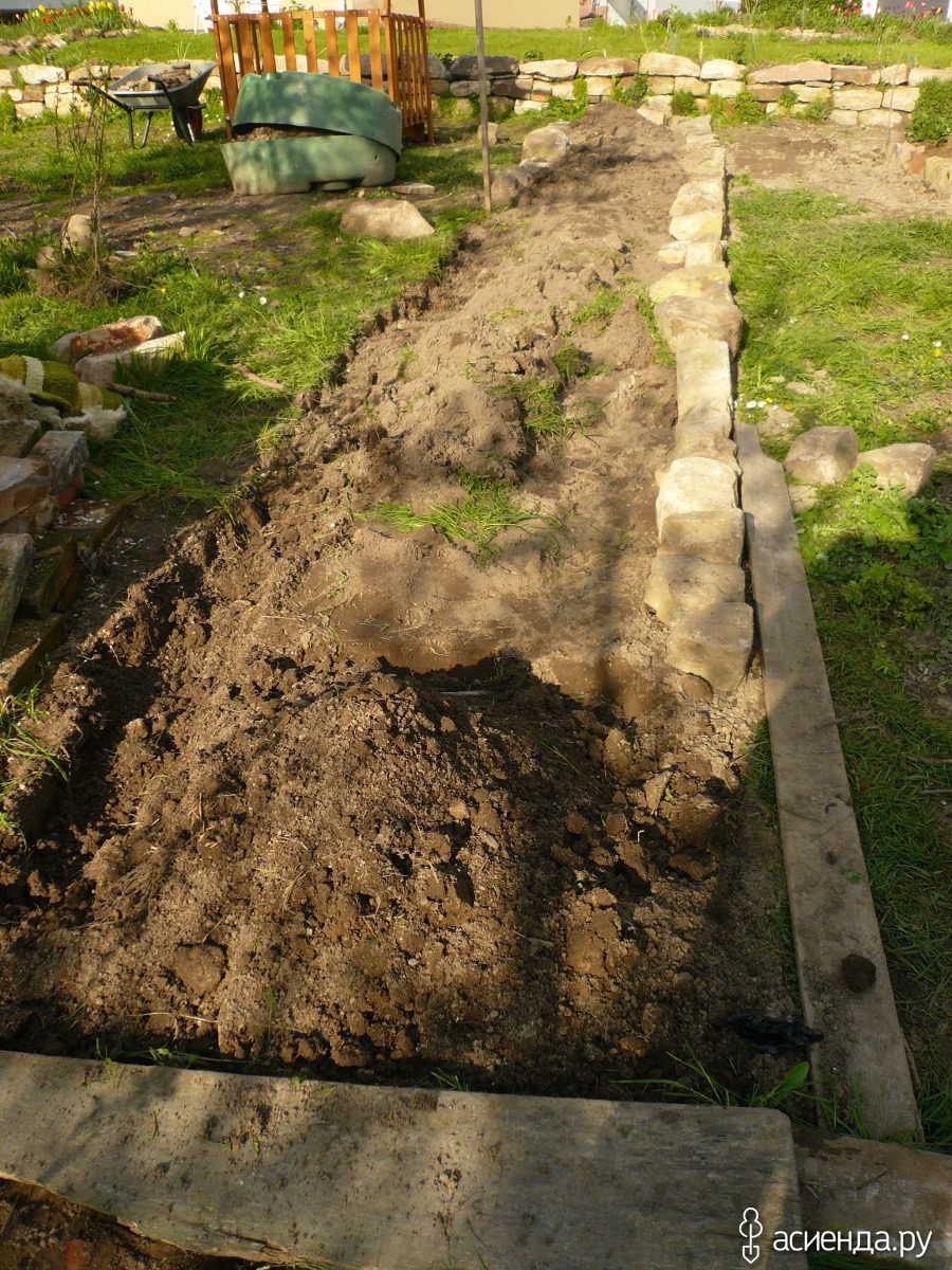 А вот этим я занималась сегодня. Делала, делала, но недоделала. Это будет новая грядка для малины. Копать было тяжело. Во первых целина, здесь не ступала нога человека с лопатой) и еще очень много камней выкапывать пришлось. По краям выкладываются наши любимые камни.