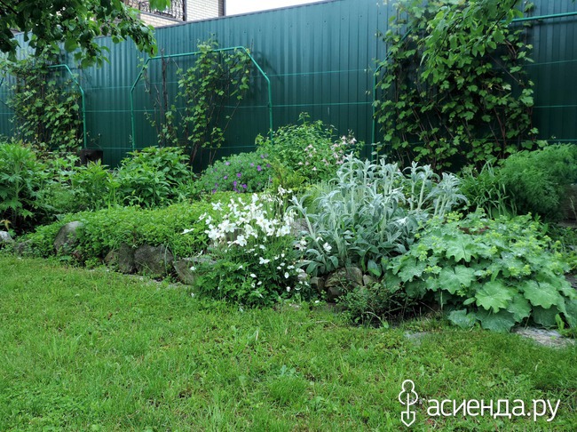Горка, когда-то здесь была теплица. Теперь растут герань, анемоны, чистец, манжетка, несколько видов очитка, почвопокровные розы, лаванда.