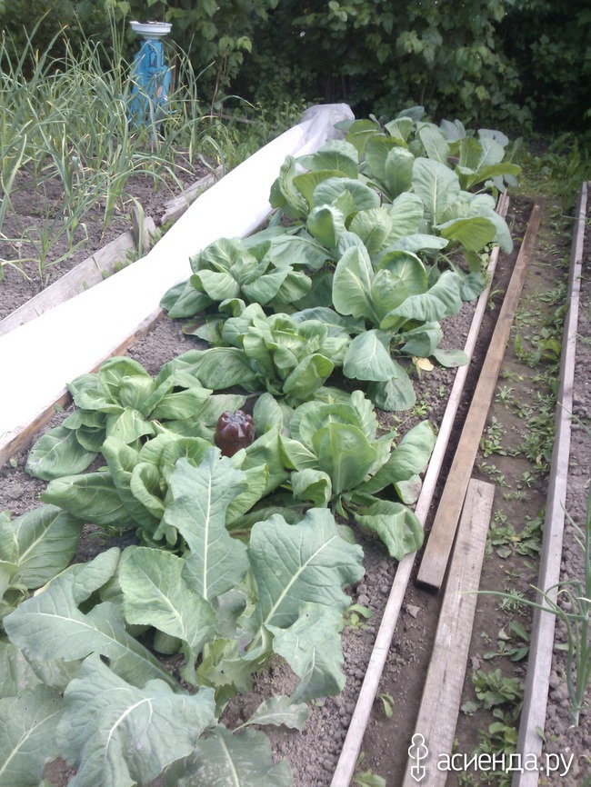 Капуста крепенькая стоит, мы ее закрываем тонким укрывным материалом, чтоб мошки не скушали раньше нас