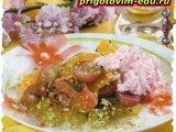Грейпфруты и апельсины очистить от кожицы, пленок и косточек, мякоть нарезать ломтиками. Ягоды винограда разрезать вдоль пополам, удалить косточки.