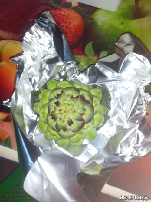 Несколько лет тому назад у нас на дачах поселились огромные колючки. Почему-то все решили, что это артишоки. Выращивали-выращивали мы этот заморский "хрукт", вырастили жирную колючку, но плодов не дождались- вырубили тунеядку! А зимой в семенном магазине напала на эти артишоки. Растить-одно удовольствие, не то что помидоры или перцы: тянется не по дням, а по часам. В мае высадила в огород, но ошибочка вышла: слишком часто посадила. Повторилась прошлогодняя история с колючкой- вымахала см. 70! Ну и где в ней съедобная полезность? И вдруг выкинула она длиннющую палку с цветком наподобие молодила. Ну, раз есть артишок-надо его есть! Покопавшись в нете, решили запекать в аэрогриле. Вот что получилось