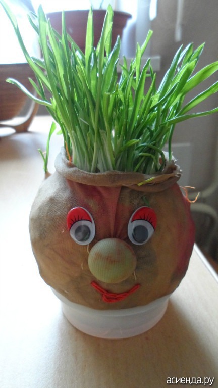 Капроновый носочек, а внутри салфетки, стоит на чашечке, куда стекают излишки воды, постепенно, добавляли семяна, жил почти год. Я даже умудрилась постирать, носочек и сменить салфетки