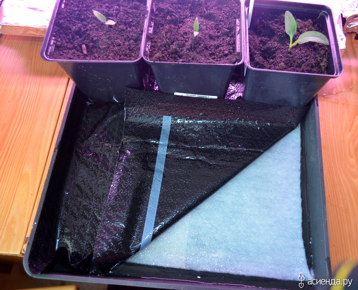Предварительно поддон застилаю капиллярным матом, наливаю в него воды, после того как мат хорошо напитается водой, излишки сливаю. Устанавливаю стаканчики с рассадой. Земля в стаканчиках обязательно должна быть влажной.