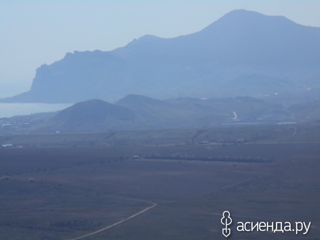 День был солнечный, но над морем и горами была дымка. Сначала заехали на гору Климентьева. гора в Крыму, близ Коктебеля, колыбель советского планеризма. Названа в память об испытателе-планеристе Петре Клементьеве, погибшем здесь во время испытаний планёра 11 сентября 1924 года. Высота горы около 200 метров, постоянно дуют ветры, что позволяет летать всем, кто желает. Правда, летать там хочется, кажется, стоит только крылья распахнуть (ну у кого они есть, естественно). С горы видна долина с квадратами виноградников, точка- это легковая машина, так для пропорции.