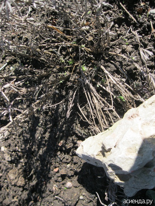 Специально для Вас вчера сфоткала свою лаванду, которую считала погибшей. Зеленых росточков не видно, вся сухая - пришлось раздвинуть кустик и придавить камнем, чтобы были видны малюсенькие зеленые росточки.