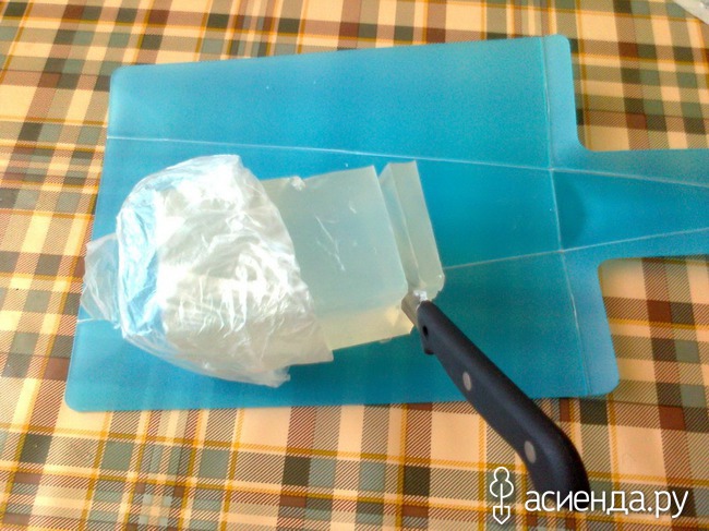 Отрезаем кусок от мыльной основы (нам нужно 100 грамм). На самом брусе есть насечки, определяющие поперечный срез в 100 грамм.