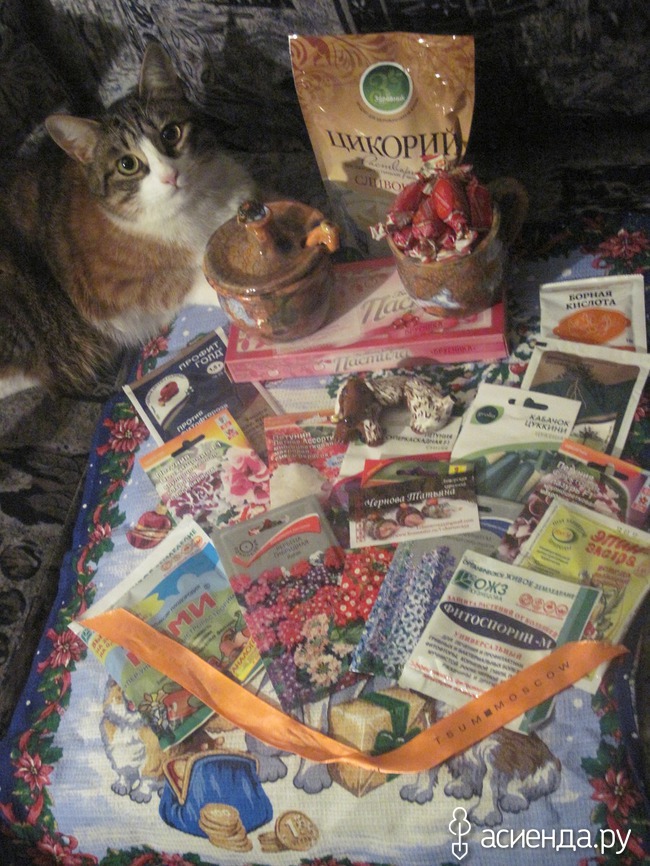 Векусняшки ( забыла пастилу сфоткать ( на общем она будет)Спохватилась и нет. А пришел старший сын, младший и муж. Чай попили. А это помощники для растюх и огорода. А это семена. Особенно спасибо Татьяне за петуньи. Вот общий вид. Масяся пришла все обнюхать. Спасибо Татьяне у меня теперь есть ее авторская керамика!!!
