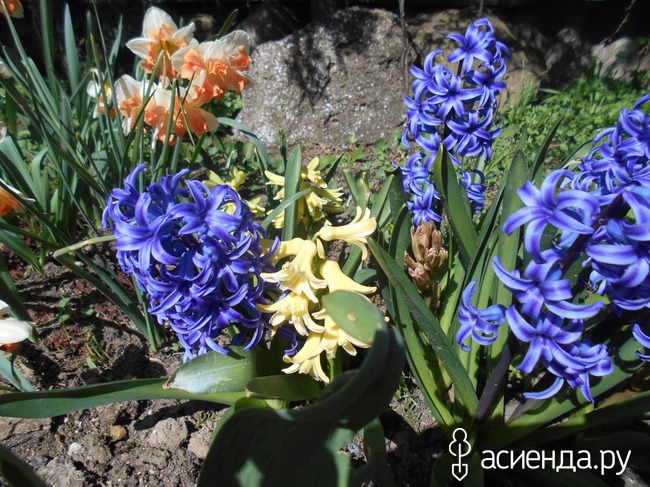 Синие и жёлтые гиацинты. Хочу найти ещё красные, но пока не удалось.