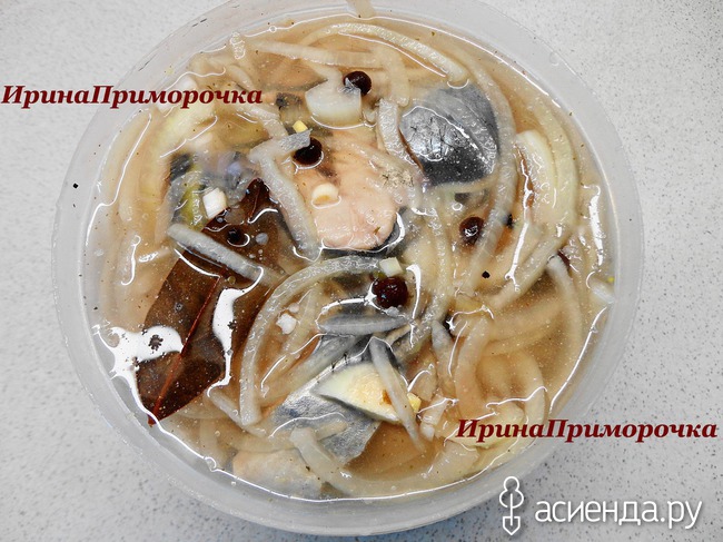 Воду доводим до кипения, всыпаем соль, сахар и специи, все хорошо перемешиваем и остужаем. Затем вливаем уксус. Рыбку складываем в контейнер или маленькую кастрюльку, заливаем маринадом.