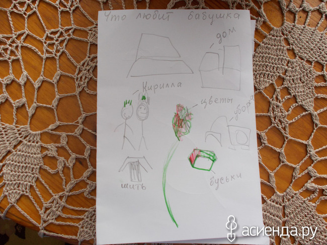У меня есть внучек. 24 сентября будет 6 лет. Как и все дети в этом возрасте имеет много талантов. Любит рисовать. Детские рисунки всегда трогательные. И в них всегда есть смысл. По рисункам видно отношение детей к семье, друзьям, родственникам. Вот одна из открыток для меня. Подписывала я, чтобы не забыть, так как собираюсь сохранить эту открытку. Открытка называется "Что любит бабушка"