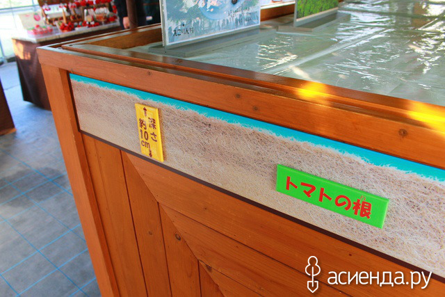 В центре огромный деревянный ящик, в нижней части емкость для жидких удобренийглубиной 10 см, есть небольшое расстояние для воздуха, вода циркулирует перемешиваясь с кислородом (я так понимаю аэрация простая), поддерживается определенная температура воды, и ph, стараются ограждать от стресса, пестициды не используются. Сверху аквариум неглубокий - для чего я не очень поняла. Корни расправляют в воде, утром и вечером по 30 минут дереву включают музыку (ох, японцы
